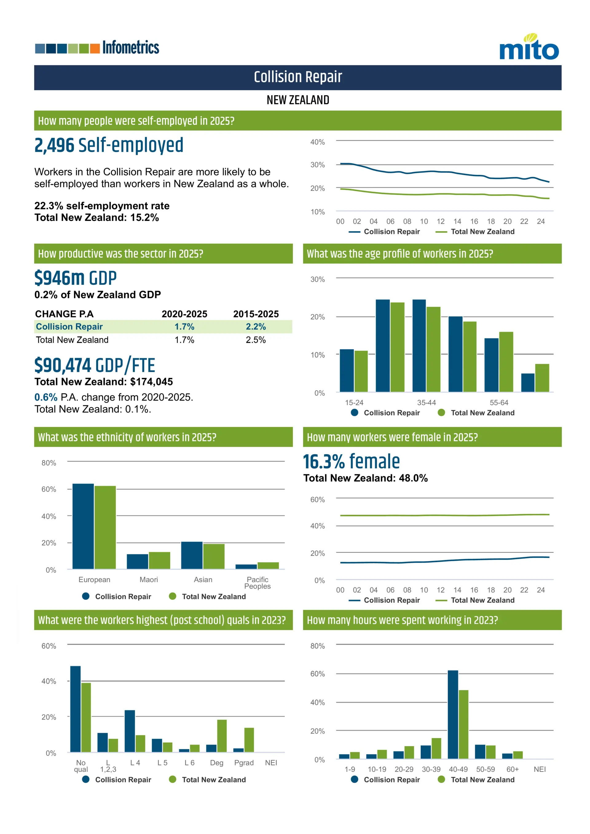 In 2025, 2,496 workers in the collision repair sector were self‑employed, representing a 22.3% self‑employment rate.