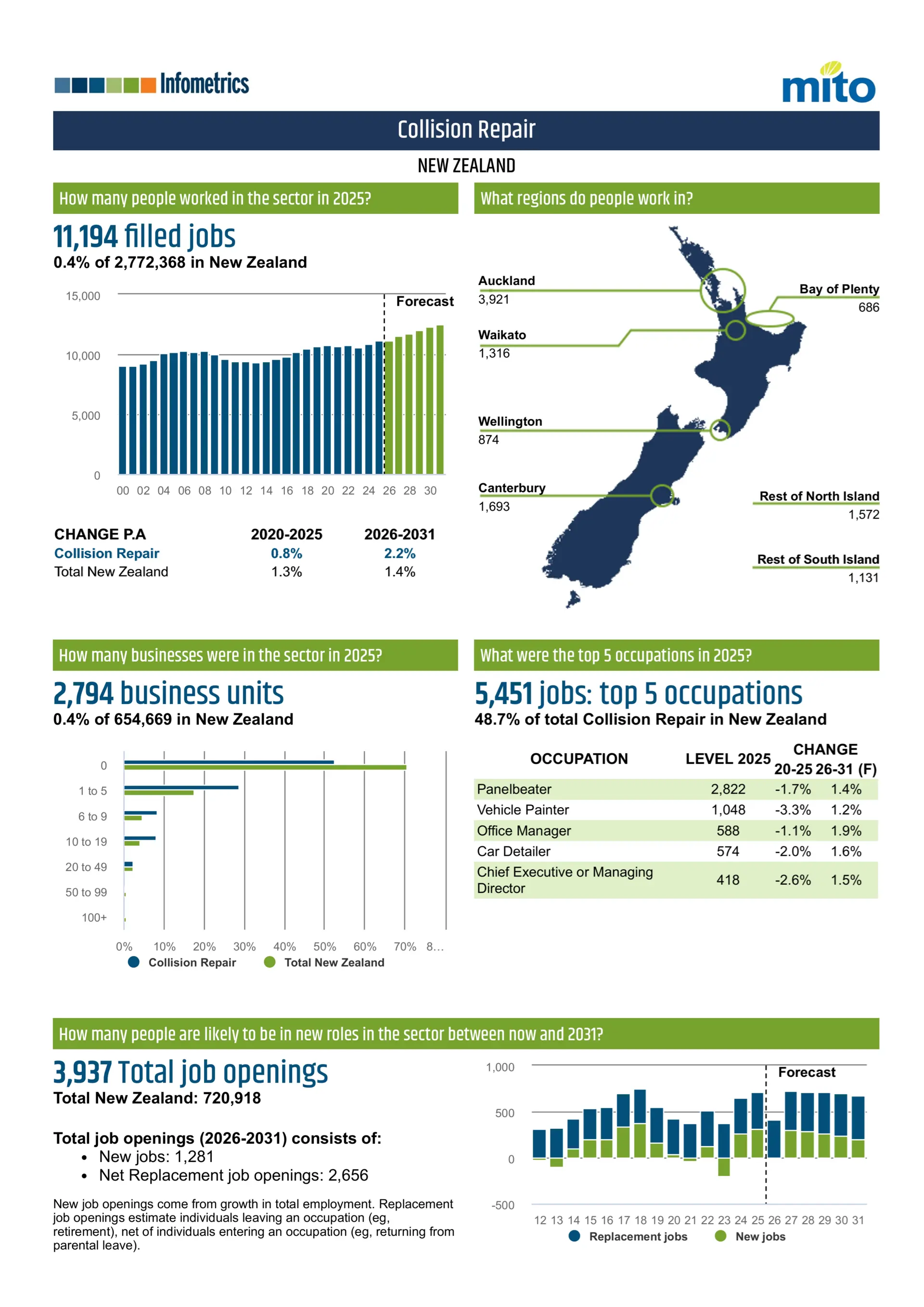 In 2025, the collision repair sector employed 11,194 people, representing 0.4% of all filled jobs in New Zealand.